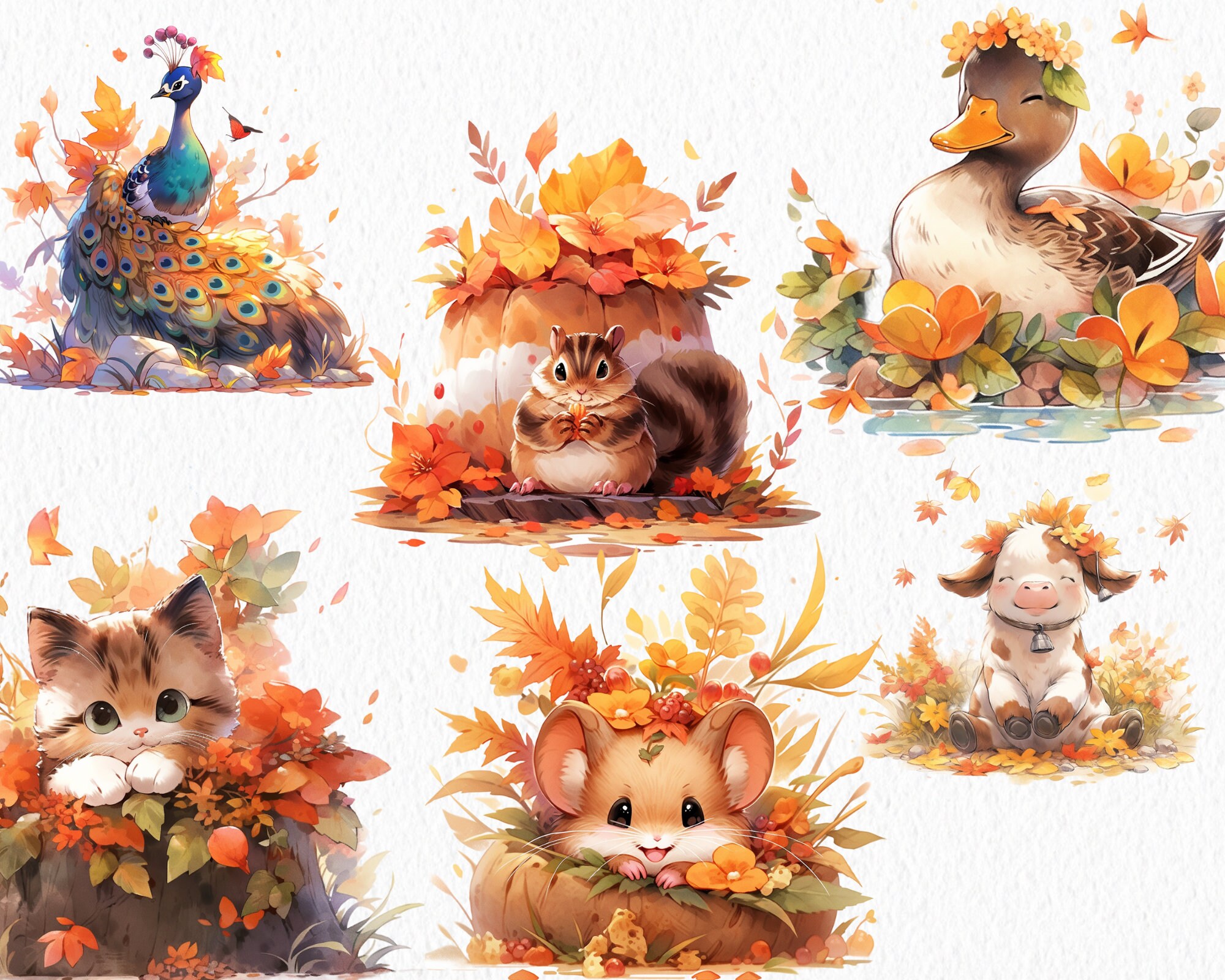 🌟 Dive into the magic of autumn with this beautiful INSTANT digital download. This is a digital product, not a physical item, perfect for creating seasonal designs. Featuring 37 charming watercolor animals that embody the vibrant essence of fall, this collection is sure to inspire your creativity.