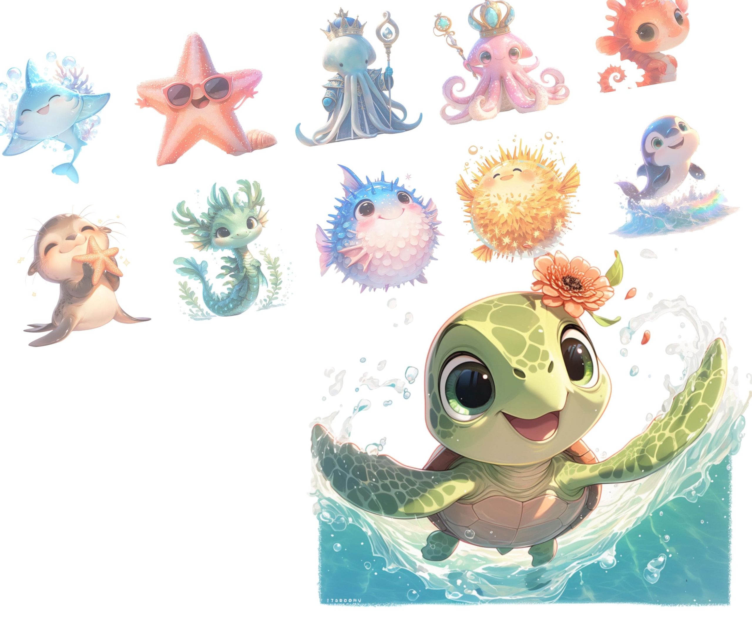 Whimsical sea creature clipart set, ocean animal clipart, underwater graphics, sea life digital download, marine SVG, sea creature PNG, nautical craft clipart, ocean-themed clip art set, digital printable graphics, DIY ocean crafts, marine life illustrations, beach party decor graphics.